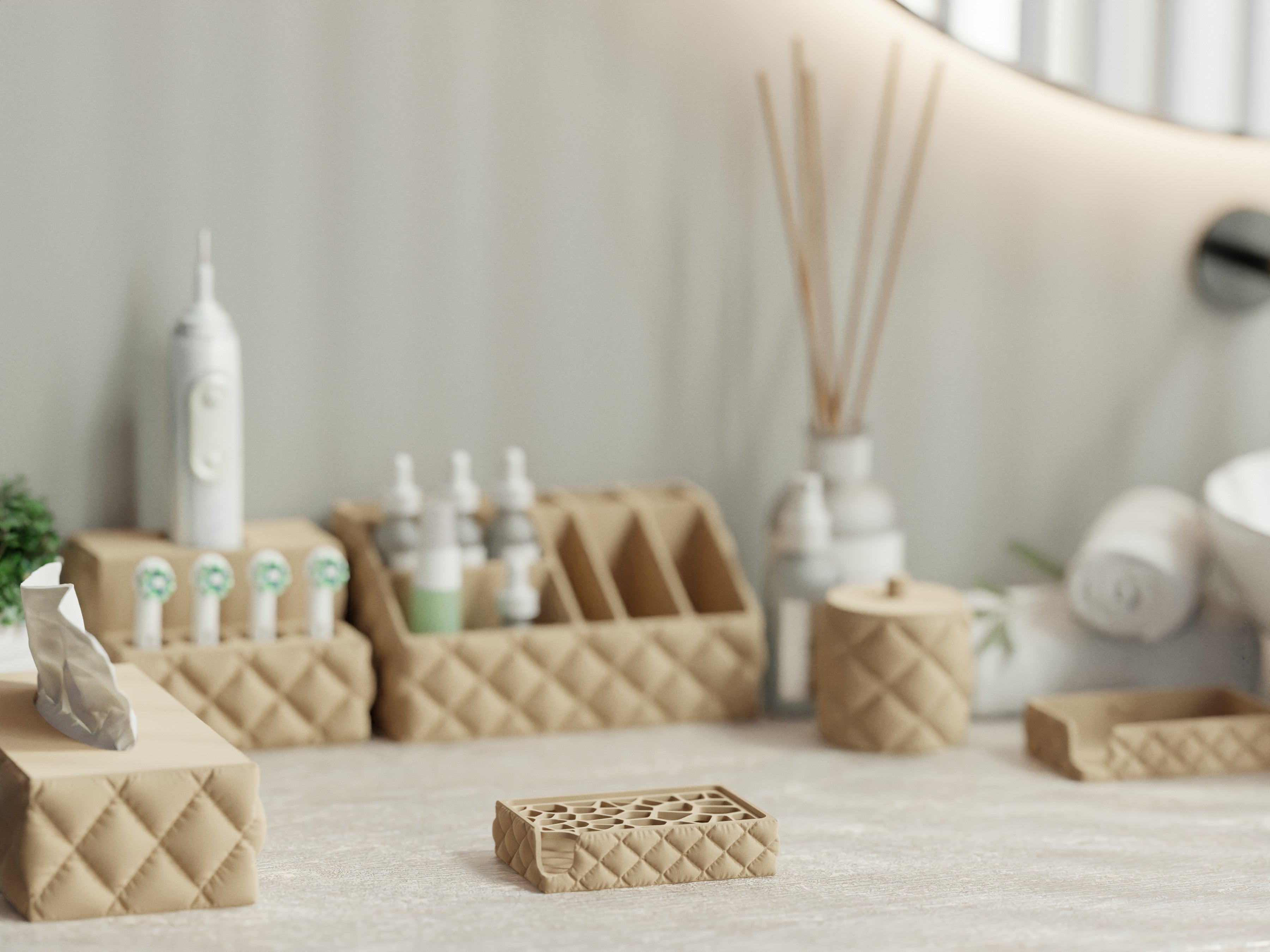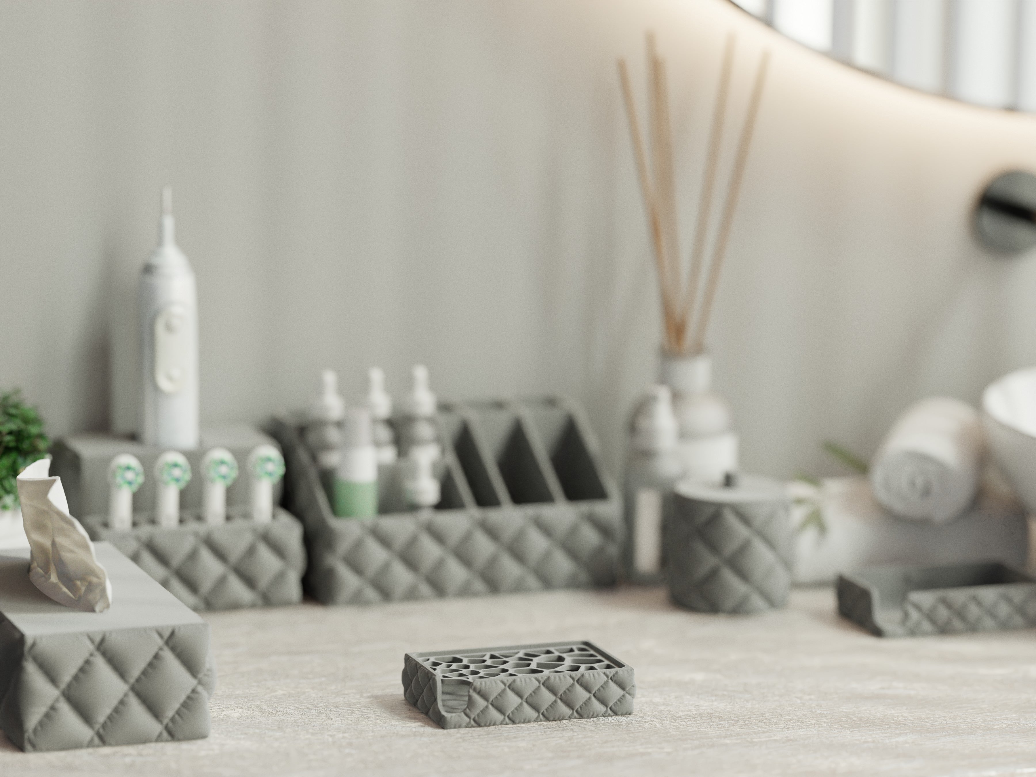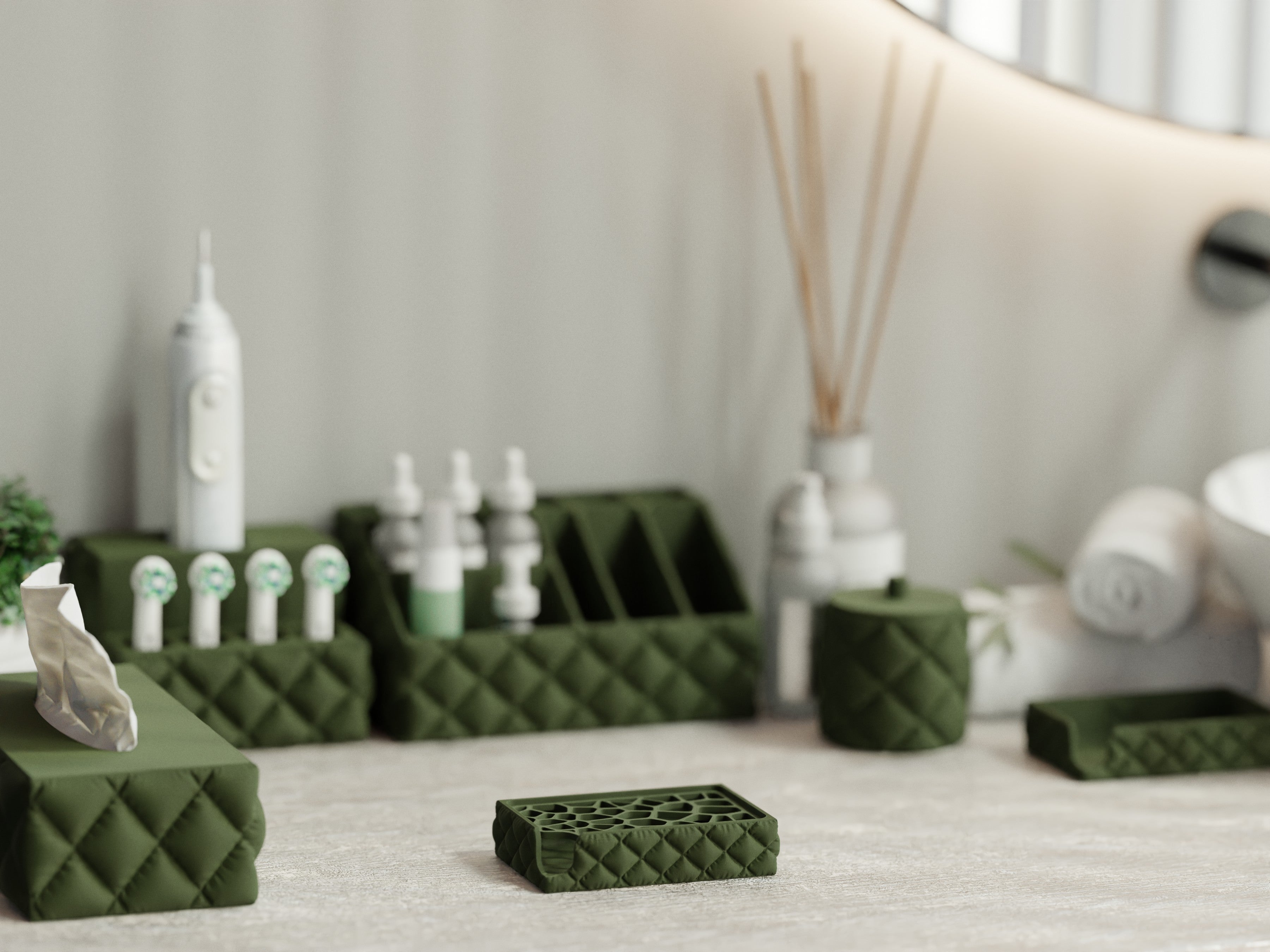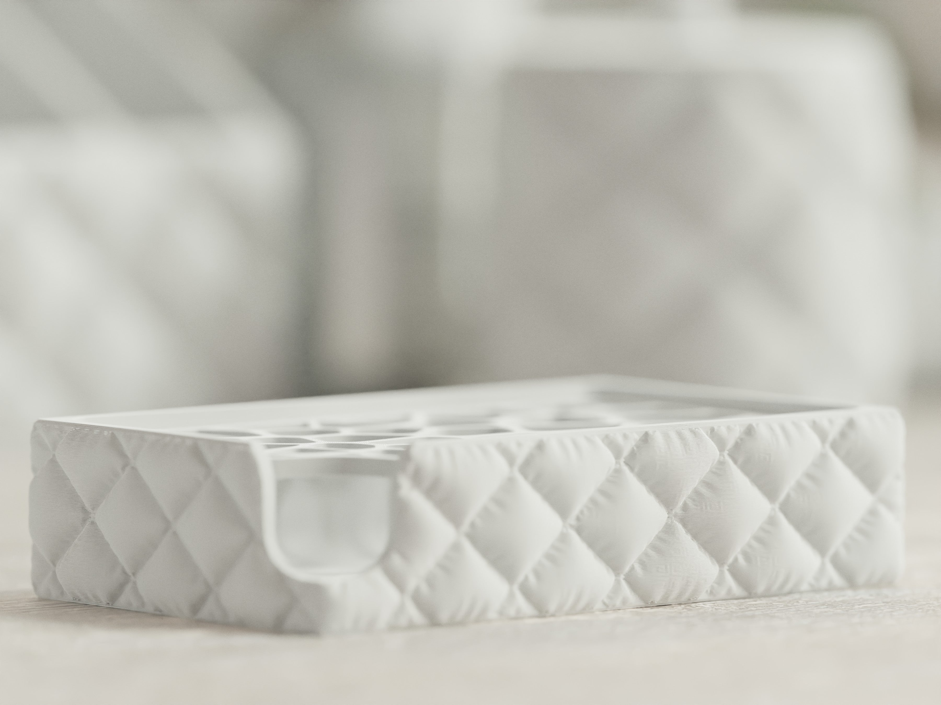 Il portasapone SoftQuilt coniuga funzionalità e raffinatezza in un oggetto compatto dalla forte presenza visiva. La sua texture trapuntata, ispirata ai tessuti imbottiti di alta gamma, aggiunge un tocco di morbida eleganza e raffinatezza a qualsiasi bagno. La base forata permette all'acqua di drenare facilmente, mantenendo il sapone asciutto più a lungo e la superficie pulita. Perfetto per chi presta attenzione a ogni dettaglio, questo accessorio impreziosisce il bagno con uno stile discreto e un fascino moderno.