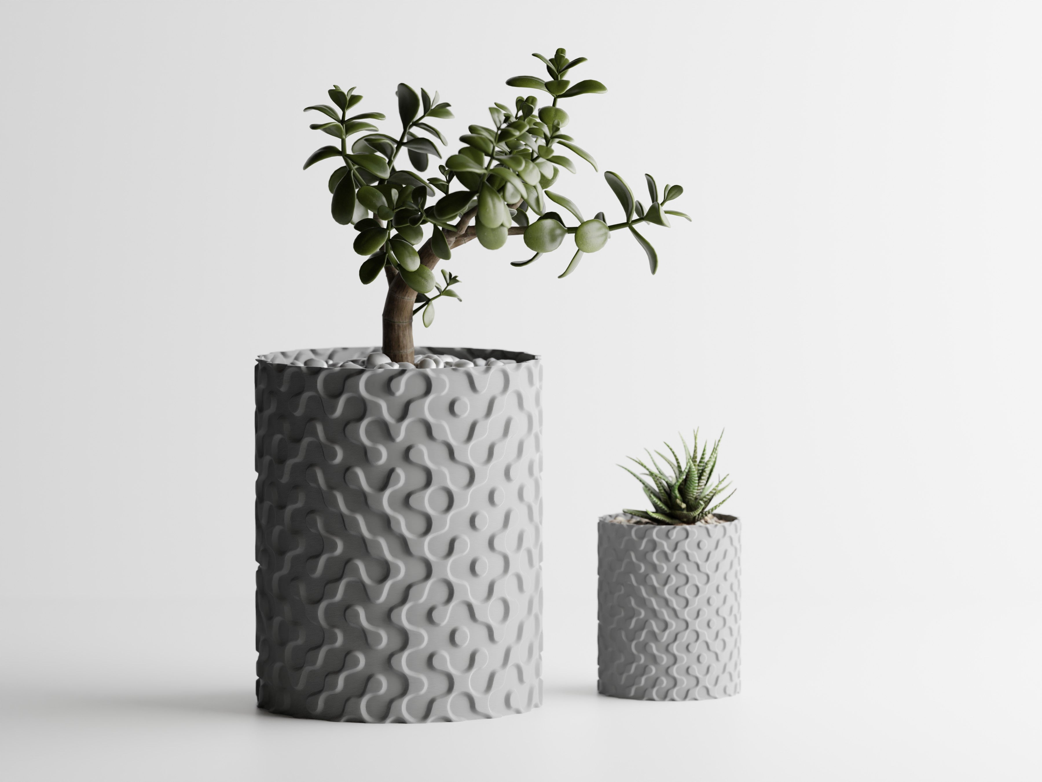 Il vaso Geo si distingue per la sua intricata texture tridimensionale, ispirata a forme geometriche organiche che si intrecciano sulla superficie in un motivo dinamico e contemporaneo. Il rilievo scolpito cattura magnificamente la luce, creando profondità e trasformando questo vaso in un elemento d'arredo raffinato e moderno. Perfetto per piante grasse, bonsai o arbusti decorativi, si adatta perfettamente ad ambienti minimalisti, urbani o creativi. Un pezzo di design che fonde funzionalità e carattere, ideale per chi apprezza uno stile moderno distintivo.